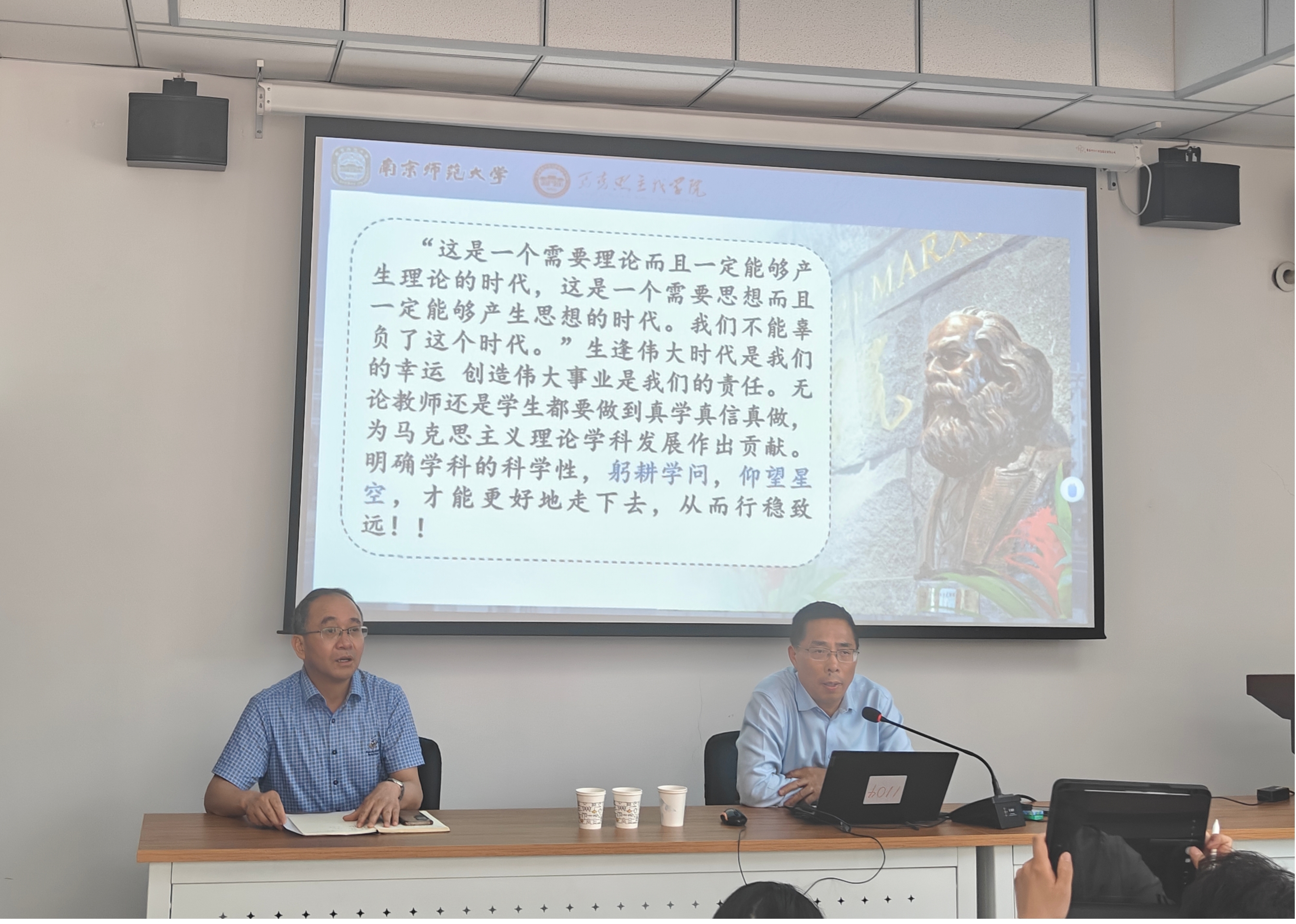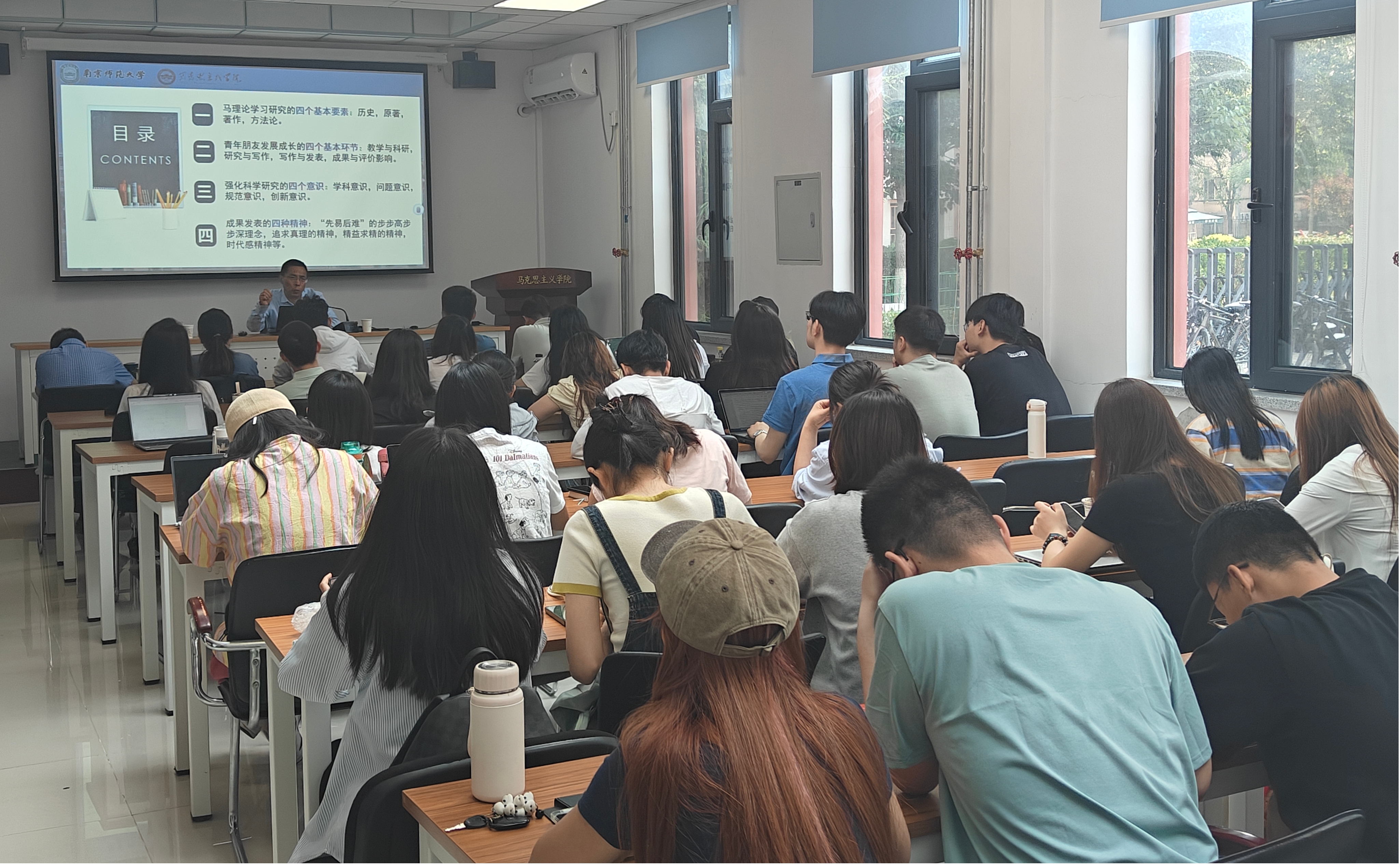 王永贵教授主要从四个“四”展开论述。首先,王永贵教授指出马克思主义理论学习研究应围绕学历史、学原著、读著作、懂方法四个基本要素展开。要学历史,了解马克思主义理论发展、变化、传播的历程;要学原著,从经典中准确把握原理;要读著作,读代表性和综合性著作;要懂方法,只有掌握科学方法才能更好地学习马克思列宁主义。其次,王永贵教授从自身科研经历出发,结合马克思主义理论的学科特色,总结出青年发展需要注意教学和科研、研究与写作、写作与发展、成果与评价四个基本环节。再次,王永贵教授提出科学研究要加强学科意识,做到在马言马、在马学马、在马讲马,在打好基础的层次上有意加强方法的突破;要加强问题意识,按照“话题-问题-课题”的思路来进行写作;要加强规范意识,规范是引领学科发展的明灯;要加强创新意识,从研究的角度、方法、切入点、思路以及呈现方式等方面进行创新。最后,王永贵教授指出生逢伟大时代是我们的幸运,创造伟大事业是我们的责任。无论教师还是员工都要心怀“先易后难”的步步高步步深理念,敢于追求真理、探寻真理,躬身学问、精益求精,立足时代、投身实践,从而行稳致远。